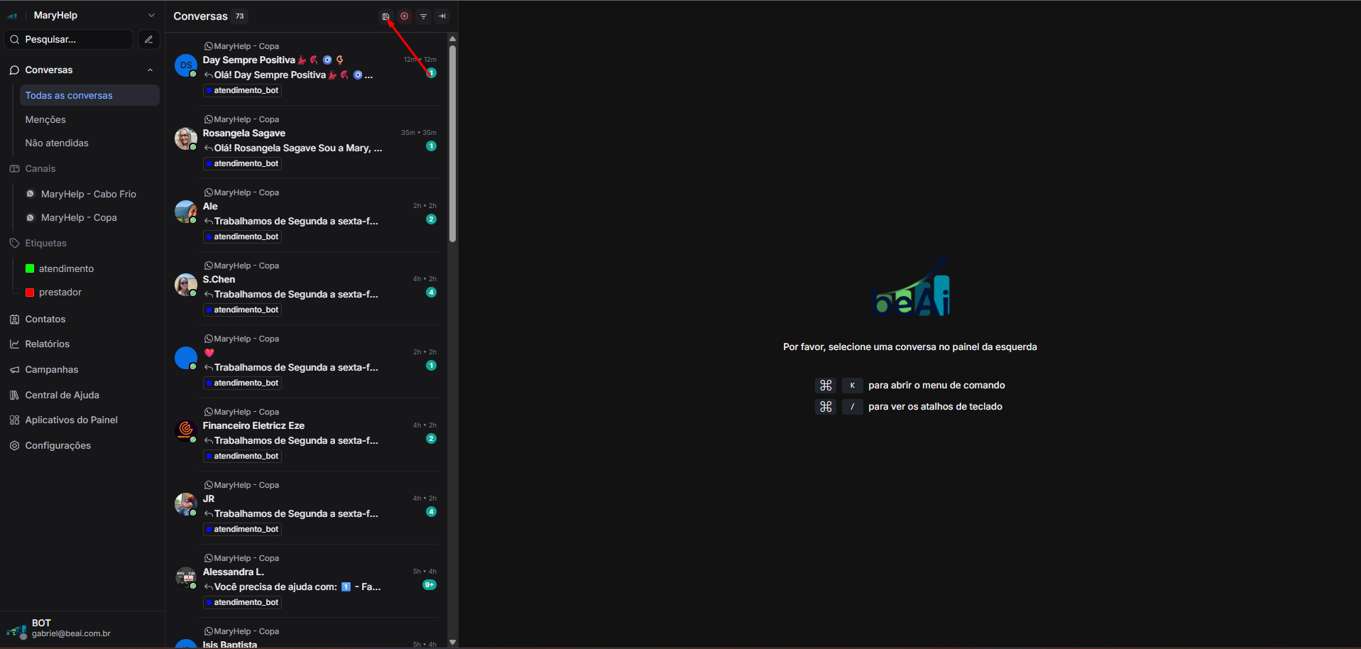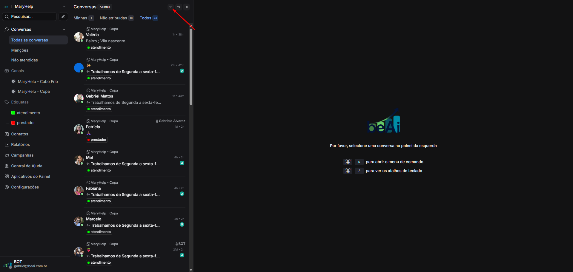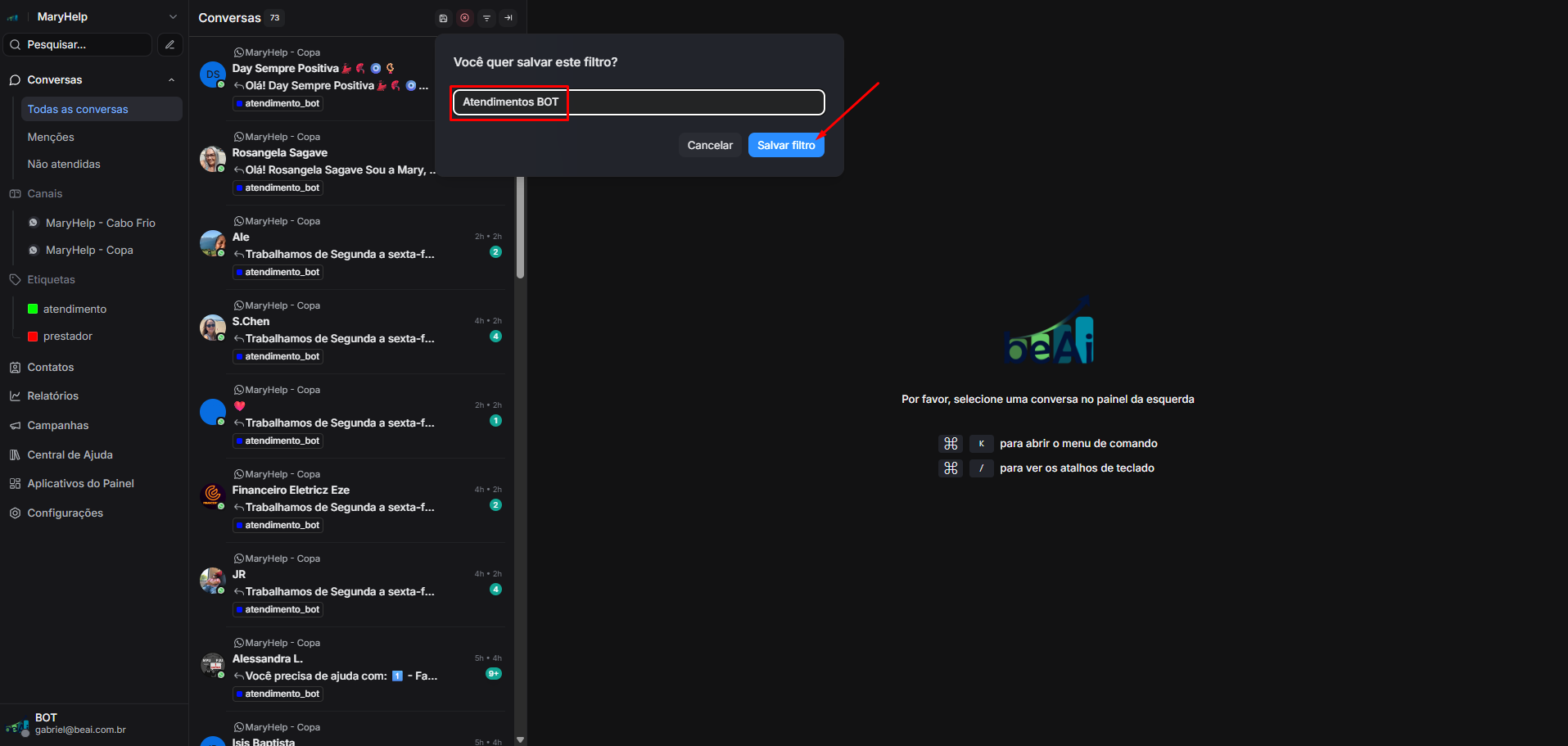Agora você rapidamente pode clicar no filtro salvo, para acompanhar os atendimentos em andamento pelo BOT