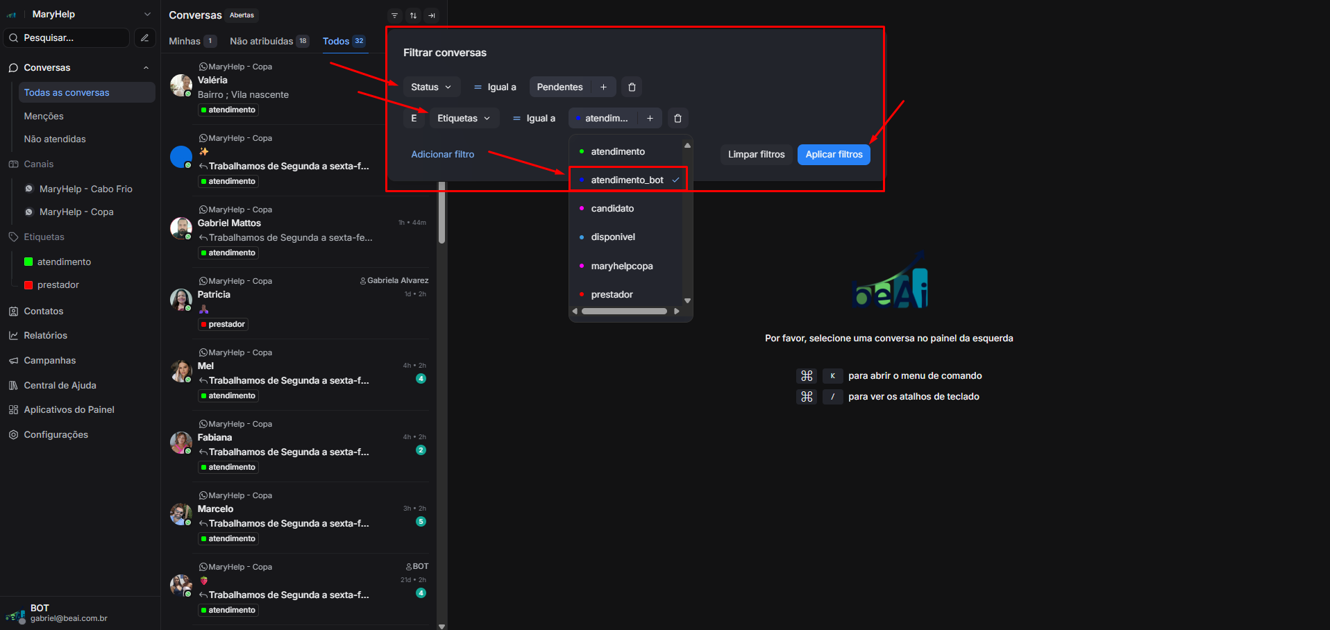 Agora observe a lista de converas filtradas para aquelas que atendem os crit;erios do filtro definido, status pendente e contem etiqueta "atendimento_bot"