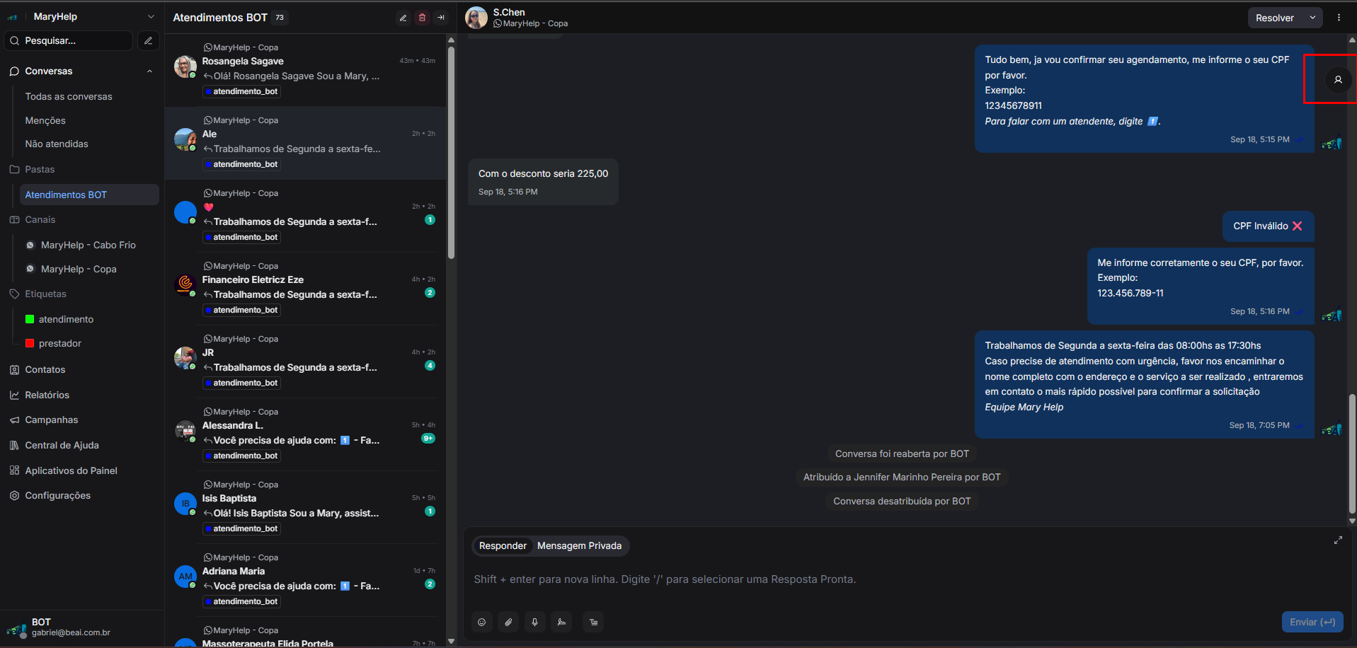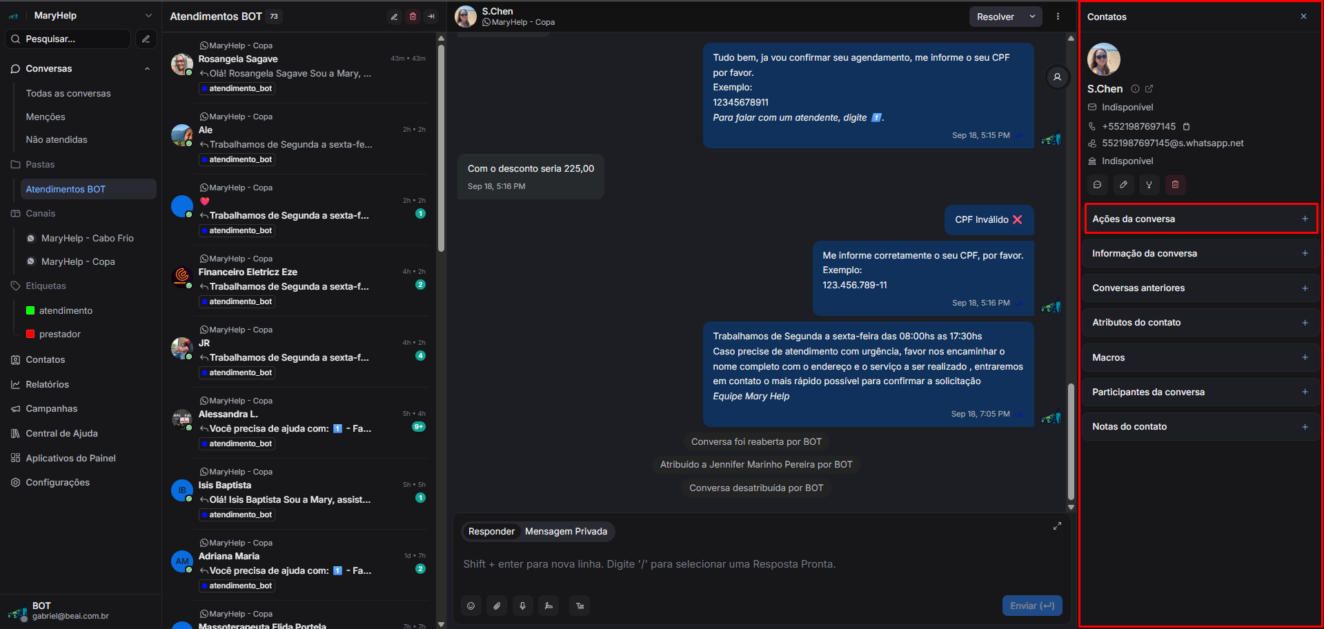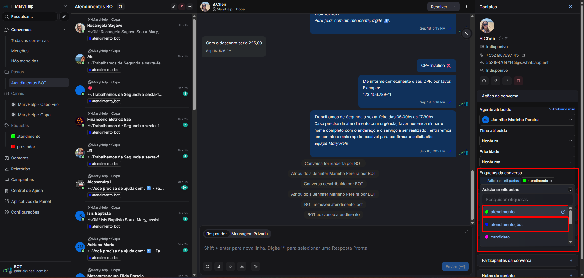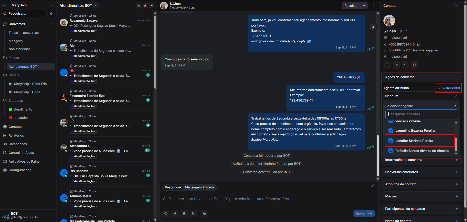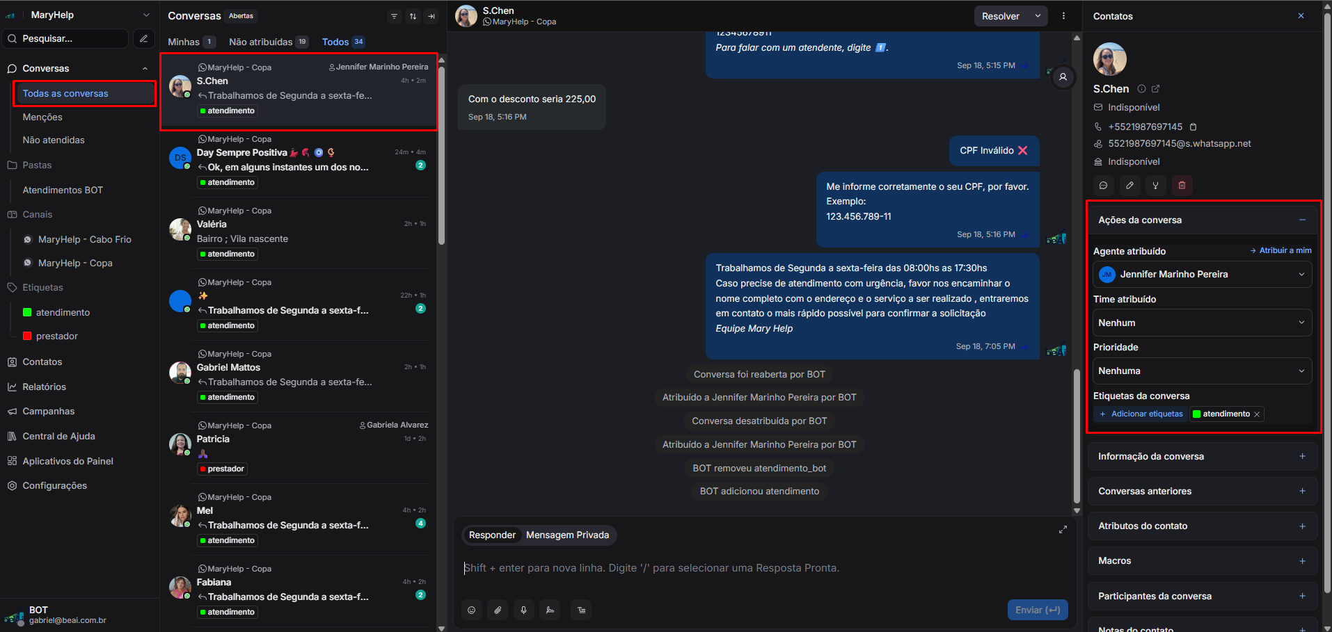 Feito isto, você pode navegar novamente a lsitagem de "Todas as conversas", e observar que a conversa da cliente "S.Chen", está presente na listagem, qualificada corretamente como "atendimento" e atribuida à atendente "Jennifer Marinho Pereira"