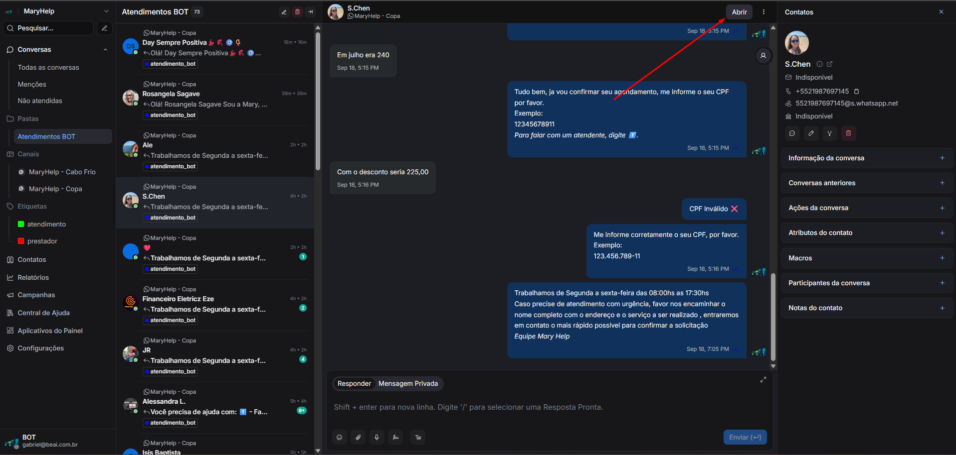 Você abriu rapidamente a lista de conversas atendidas pelo BOT e identificou que a cliente ‘S.Chen’ está com dificuldades no autoatendimento. Para assumir o atendimento manual, clique no botão ‘Abrir’, localizado no canto superior direito da conversa.
