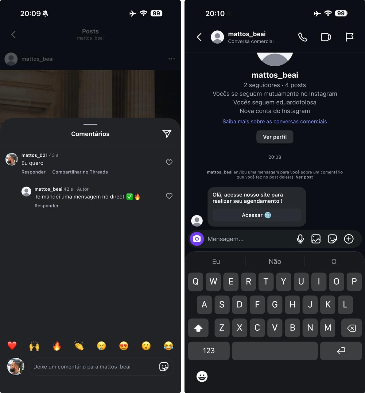 A automação, responde ao comentario que foi postado contendo a palavra chave, e envia uma mensagem privada ao usuário que publicou este comentario.