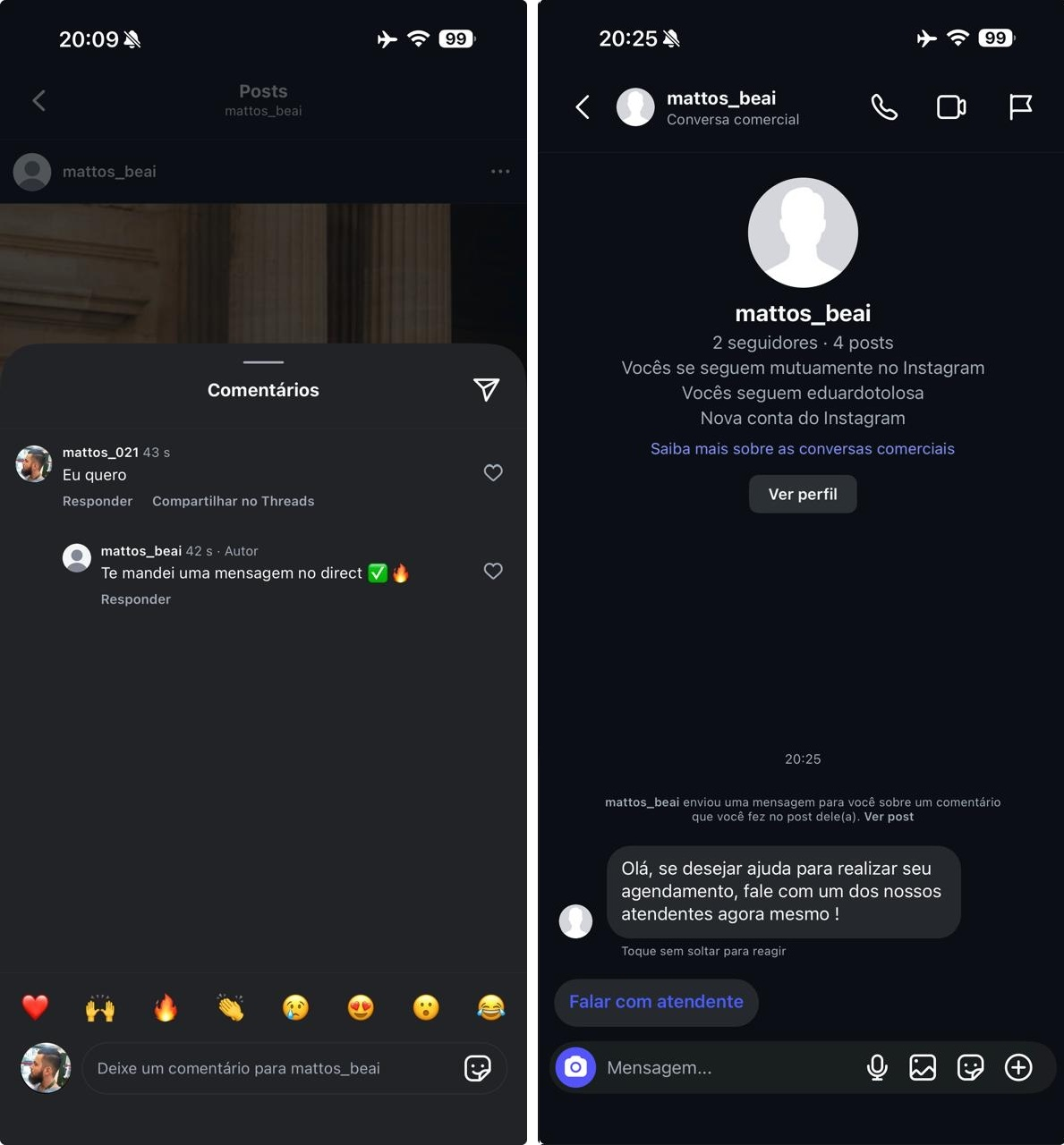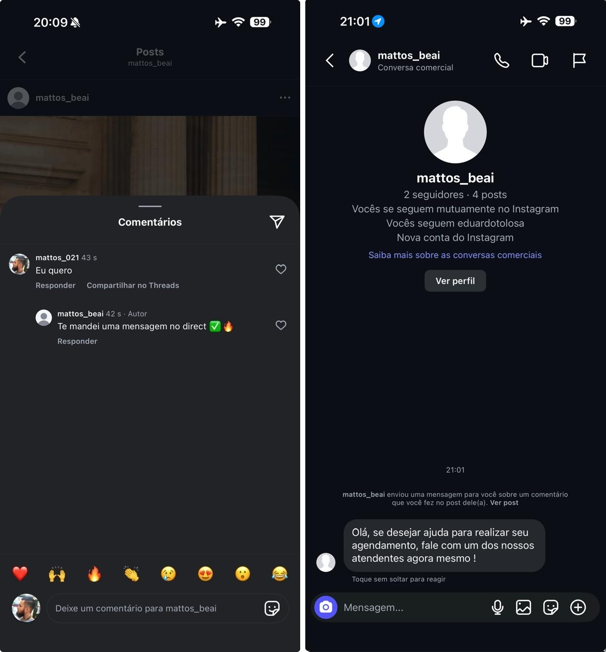 Aqui há um exemplo da automação configurada para responder ao comentarios em qualquer publicação contendo a palavra "eu quero", responde ao comentario com "Te mandei uma mensagem no direct ✅🔥" e envia uma mensagem privada ao autor do comentario "Olá, se desejar ajuda para realizar seu agendamento, fale com um dos nossos atendentes agora mesmo !" contendo uma resposta rapida "Falar com atendente"