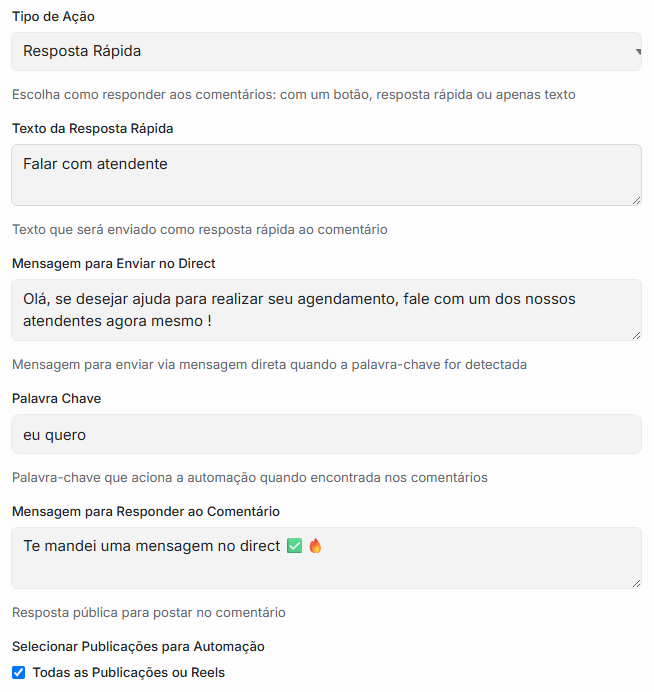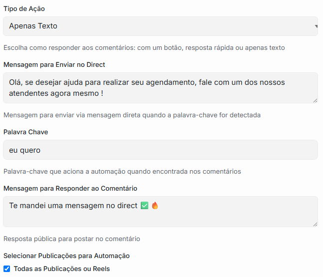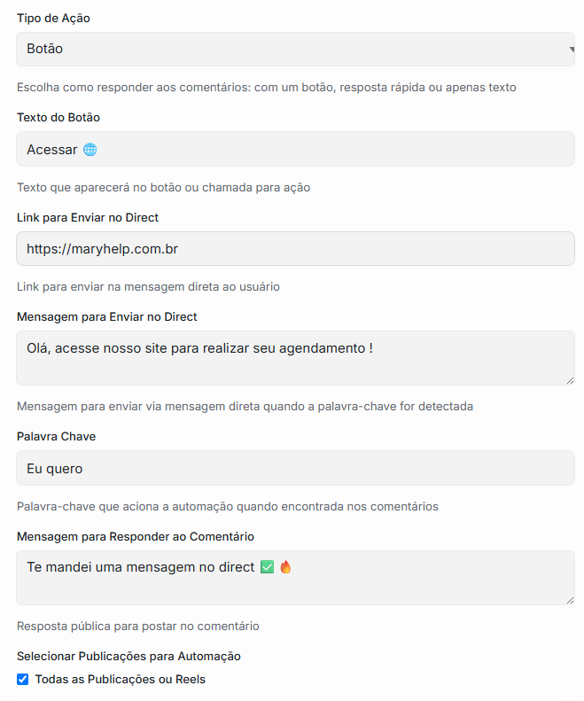 Palavra Chave: Palavra-chave que aciona a automação quando encontrada nos comentários.