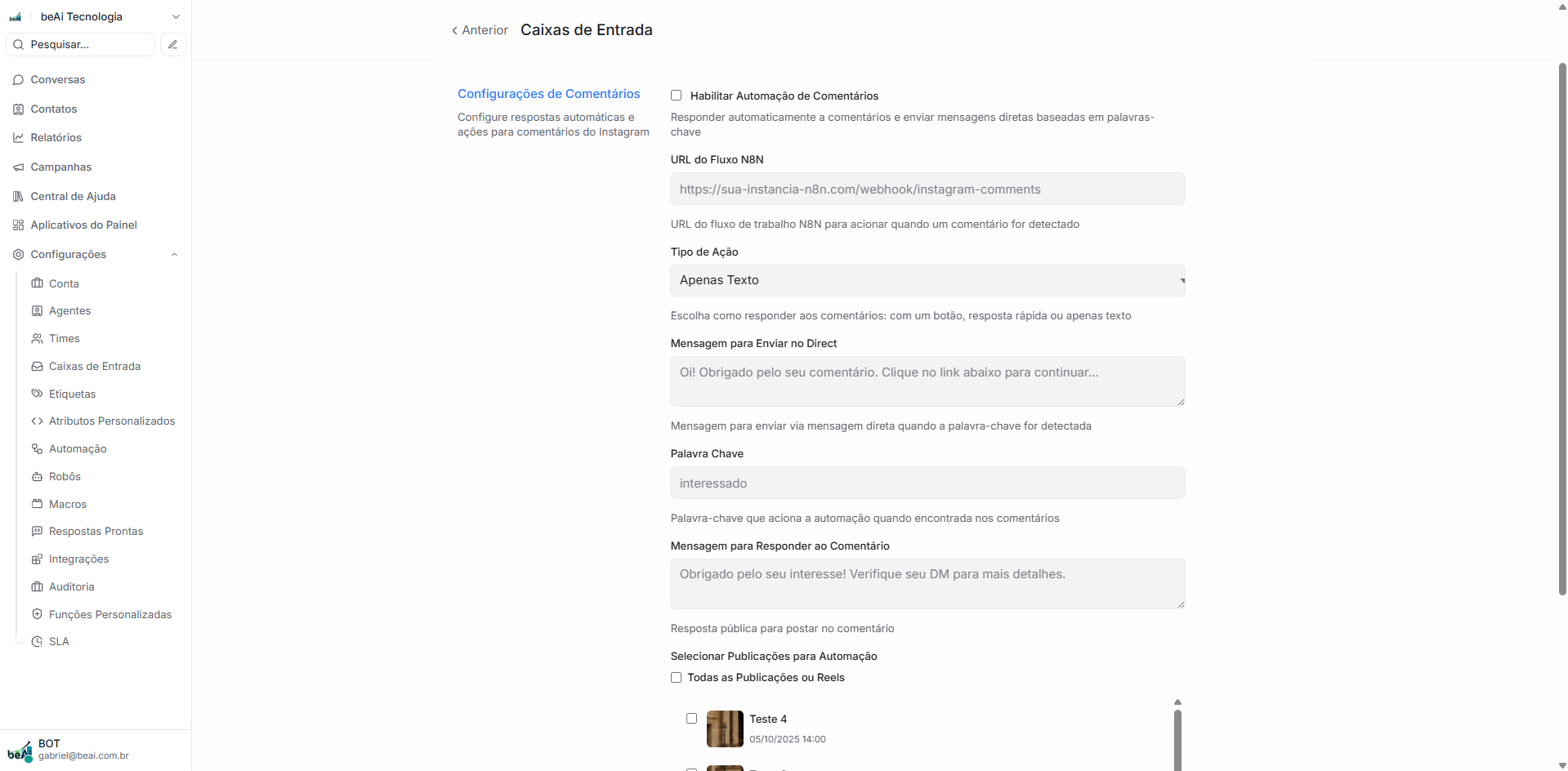 Através das configurações avançadas de uma caixa de entrada do Instagram, é possivel automatizar comentários em suas publicações.