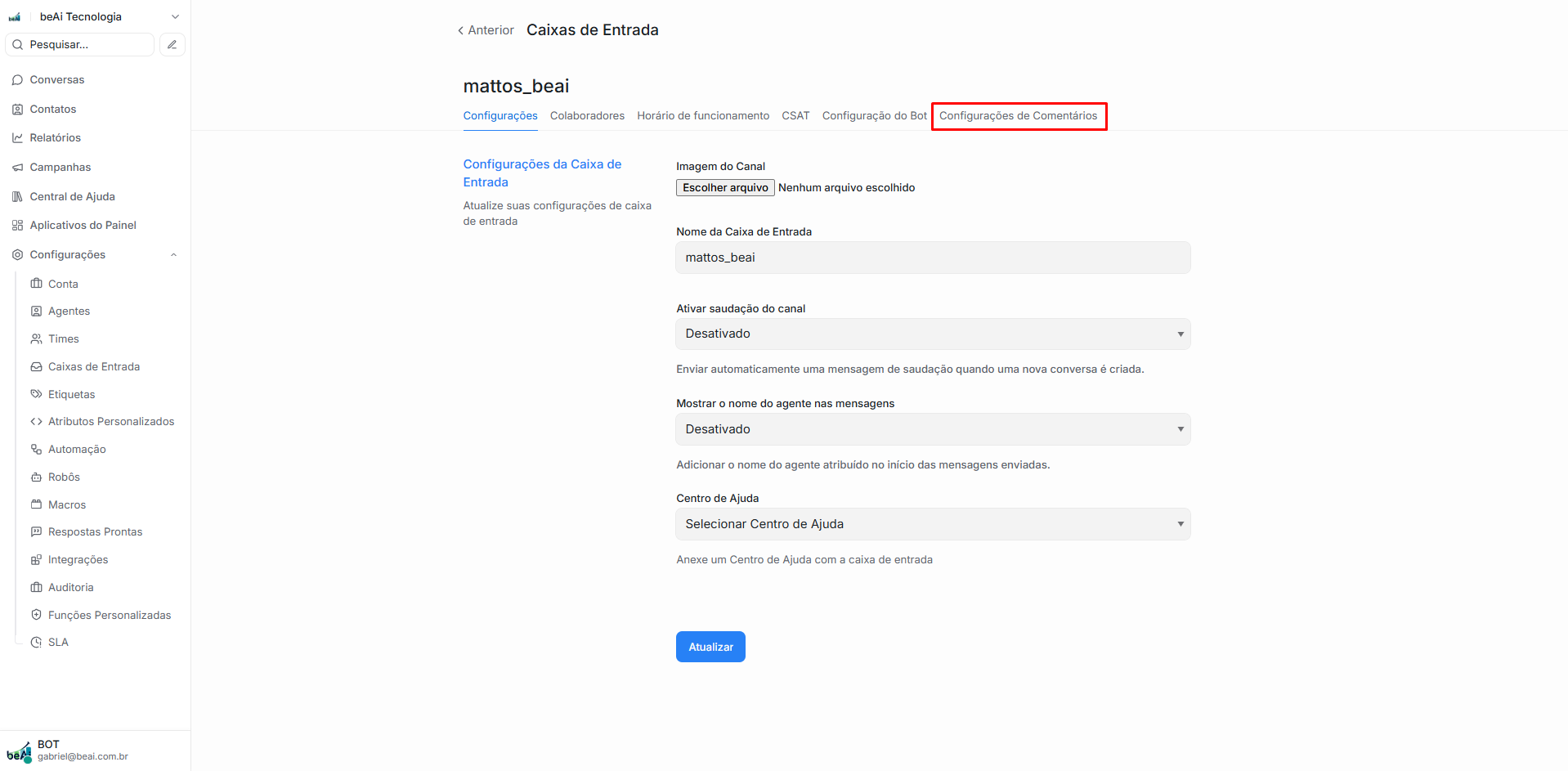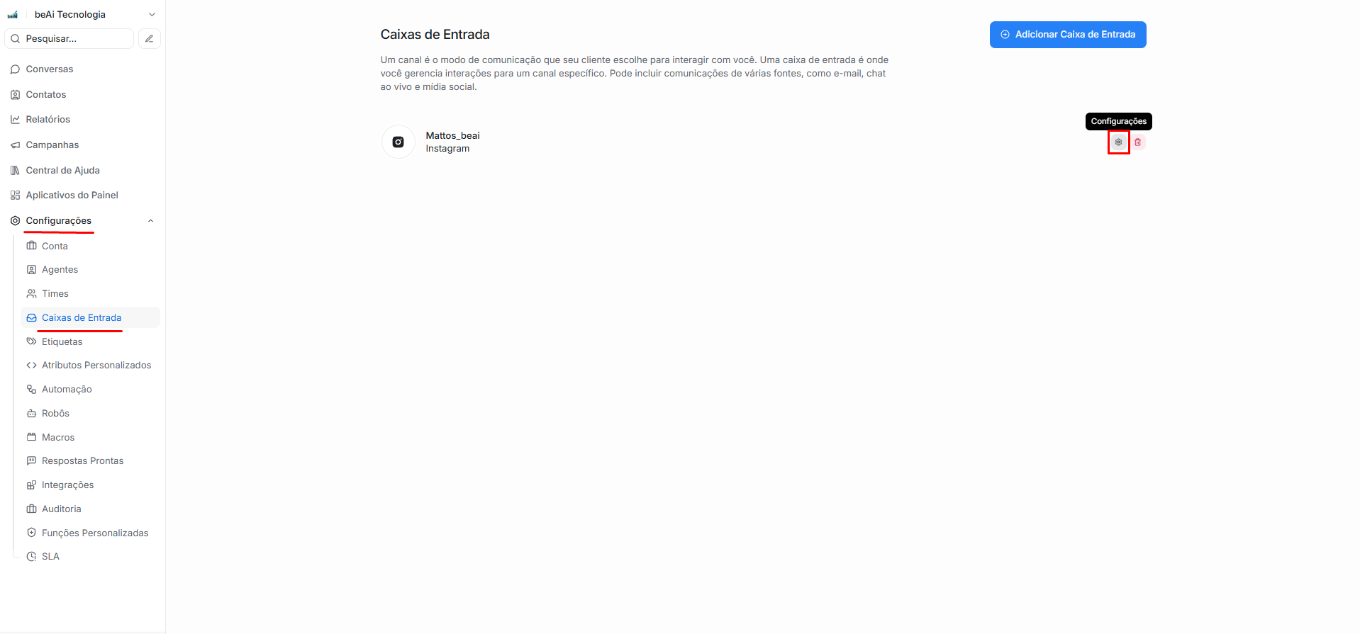 Na tela inicial, navegue até "Configurações" > "Caixas de Entrada", agora clique em configurações na caixa de entrada de instagram que deseja habilitar a automação de comentários.